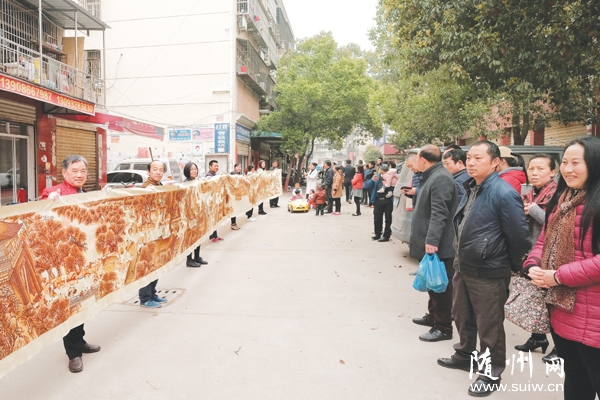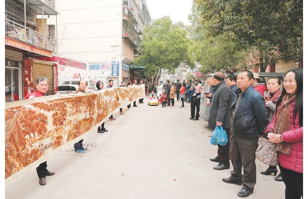 随州网讯 随州市曾都区东城天生街退休女职工刘学琴历时5年绣成巨幅《清明上河图》双面十字绣。该十字绣长18米,宽1米,是根据2010年上海世博会限量发行的张择端所绘的《清明上河图》模版精绣而成。 (记者 李文军摄)