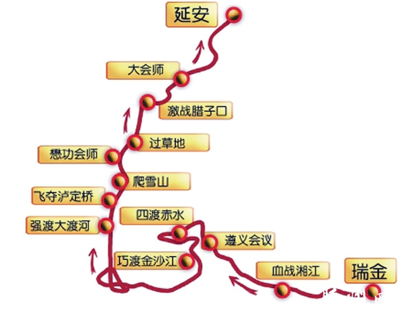 中央红军长征路线图 ●时间1934年10月10日-1936年10月22日 ●中央红军(红一方面军)途经11省 1934年10月10日,中共中央、中革军委率领中央红军第1、第3、第5、第8、第9军团,以及中央纵队和军委纵队共8.6万余人,从江西瑞金等地出发,开始长征。经粤北、湘南、桂北、黔北、川南等地区,一路西行,在滇北的皎平渡等地渡金沙江北上。1935年6月,与红四方面军在四川懋功(今小金)会师。 10月19日,红军到达陕甘苏区的吴起镇 (今吴起县城),胜利结束长征。一路上,他们途经江西、福建、广东、湖南、广西、贵州、云南、四川、西康、甘肃、陕西等11个省,行程二万五千里。 ●红二方面军途经9省 1935年11月19日,红2、红6军团共1.7万余人从湖南省桑植县刘家坪等地出发,退出湘鄂川黔苏区,开始长征。他们经湘中、湘南,西入贵州,进入滇北,一路西进,在丽江的石鼓、巨甸等处渡金沙江北上。1936年7月,他们在西康甘孜与红四方面军会师,并正式建立红二方面军,全军共1.3万余人。 随即,他们与红四方面军共同北上,经青海东部、四川北部进入甘南,10月22日在甘肃静宁以北的将台堡(今属宁夏西吉)与红一方面军会师。一路上,他们途经湖南、湖北、贵州、云南、西康、四川、甘肃、青海、陕西等9个省,行程二万余里。 ●红四方面军途经4省 1935年3月初,红四方面军、地方武装和苏区机关人员共约10万人,离开川陕苏区,开始长征。6月与红一方面军在懋功会师。 1936年7月,红四方面军与红二方面军共同北上。10月9日,他们到达甘肃会宁,与红一方面军会师,胜利结束长征。途经四川、西康、青海、甘肃等4省,行程达一万余里。 ●红25军途经4省 1934年11月16日,鄂豫皖苏区的红军第25军2900余人,根据中共中央指示,从河南省罗山县何家冲出发,向平汉铁路(今北京—汉口)以西转移,开始长征。1935年1月至5月粉碎国民党军两次“围剿”,创建了鄂豫陕苏区,部队发展到3700余人。 1935年7月16日,为配合红一、红四方面军北上,红25军再次从鄂豫陕苏区出发,经县(今户县)、 (今周至)西进,继续长征。经过陕南、甘南地区,他们于9月15日到达陕甘苏区的永坪镇,次日同西北红军第26、第27军会师,胜利结束长征。一路上,他们途经河南、湖北、陕西、甘肃等4省,行程近万里。