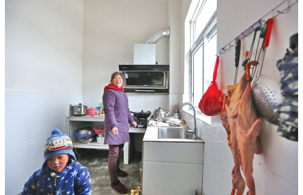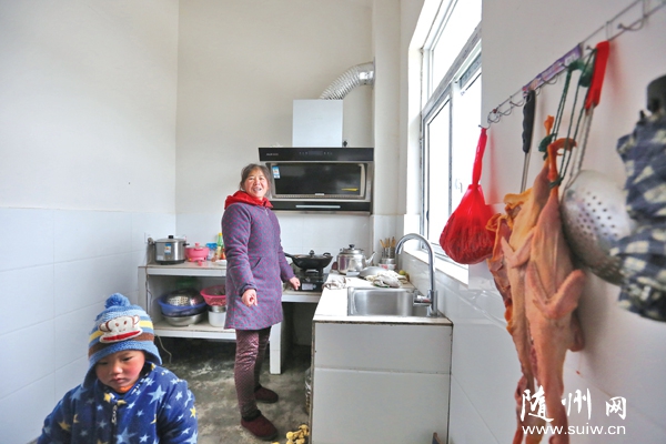 广水市吴店镇中心村村民沈宪秀在赵家湾安置点新房里准备做饭。