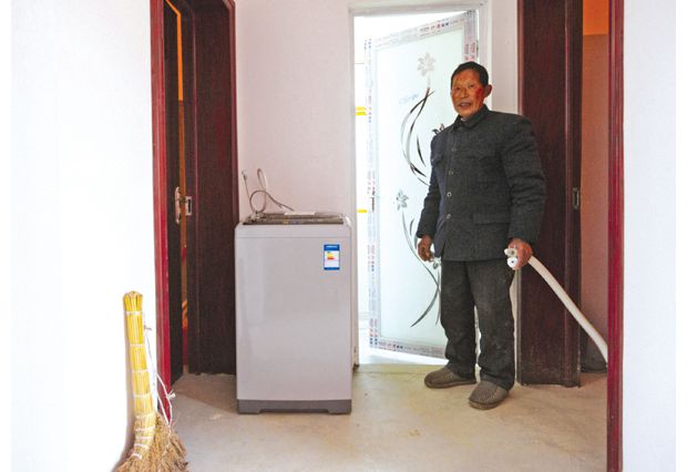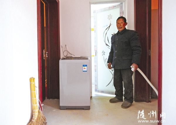 曾都区万店镇落天坡村5组贫困户肖世禄的女儿为他买了一台洗衣机,送到他的新房里。