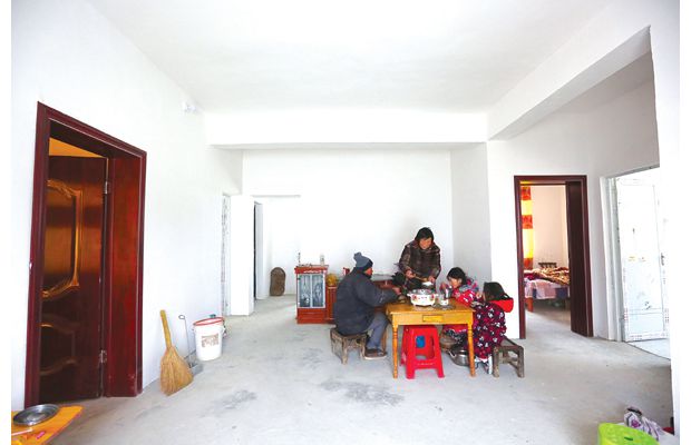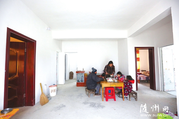 1月18日,曾都区万店镇落天坡村贫困户宫新贵夫妇和两个孙女在125平米的新家里吃早餐。