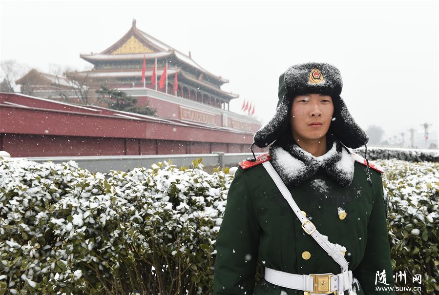 2月21日,一名武警战士在北京天安门城楼前执勤。当日中午时分,北京市区迎来降雪天气。 新华社记者 罗晓光 摄
