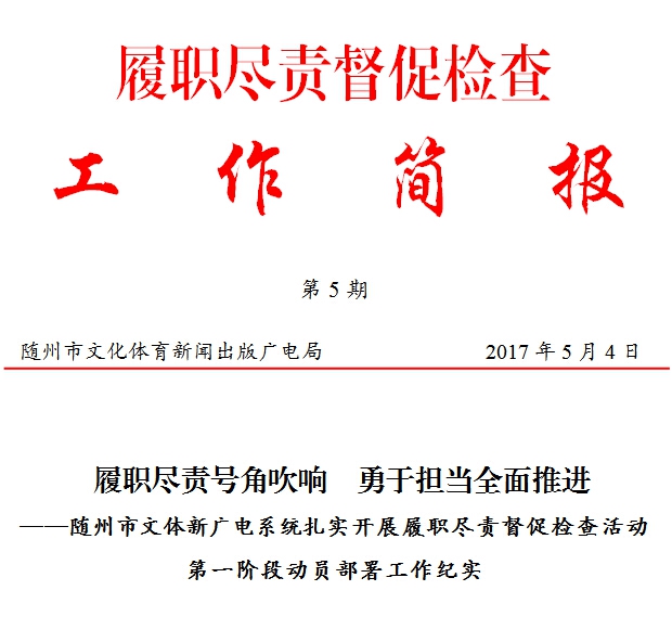 全省文化系统接受履职尽责督促检查工作视频会议,犹如吹响了接受履职尽责督促检查工作进军的号角,振奋精神、催人奋进。随州市文体新广局摇旗呐喊,披挂上阵,在省文化厅、随州市委、市政府等上级部门的正确领导和指导下,迅速启动接受履职尽责督促检查工作,拟定工作方案、成立工作专班,宣传动员,严密部署。4月上旬以来,全市文体新广系统顿时掀起了接受履职尽责督促检查工作的热潮,大家接受履职尽责督促检查的工作理念被强化了,其促进工作、转变作风、增强意识、主体责任意识等在实际工作中得到了充分的体现。 一、抓好宣传发动,营造浓厚氛围。 在全市文体新广系统开展履职尽责督查活动启动之初,为认真贯彻落实全省文化系统接受履职尽责督促检查工作视频会议精神,市文体新广局党组召开专题会议,结合全市文体新广系统工作实际,充分认识到,接受履职尽责督促检查工作,是推动我市文化改革发展的重要动力,是解决各项工作存在问题的难得机遇,是改进工作作风的有力抓手,会议统一思想,形成共识,明确工作内容,明确工作要求,明确工作时间节点,制定工作方案,周密部署。4月17日,市文体新广局组织各县、市、区,局属各单位召开了全市文体新广系统接受履职尽责督促检查工作动员会。局党组书记、局长黄苹同志在会议上指出,这次会议即是动员大会,也是讨论会,更是工作的明确会、工作任务布置会。在对《2017年度全市文体新广系统接受履职尽责督促检查工作实施方案》充分讨论后,黄苹同志指出,接受履职尽责督促检查是对全市文体新广系统履职尽责督促检查成效的一次全面“体检”,也是发现问题,改进工作的有利契机,要坚定信心,变压力为动力,变考验为机遇,全力打好这场硬仗。重点做到“六个明确”,一是明确督查对象;二是明确督查内容;三是明确时间节点;四是明确工作措施;五是明确工作目标;六是明确几个结合。黄苹同志神情严肃,语重心长,掷地有声,全面详尽阐述了履职尽责督促检查重要意义,内容目标,工作措施,要求各地、各单位全面落实会议精神,快速启动,拿出可行实施方案。在各地、各单位开展宣传发动的同时,局机关召开活动领导小组办公室会议,黄苹同志对综合协调、调研督查组、材料组、宣传组的工作职能、职责进行明确强调。局机关、局属单位,各县、市、区文体新广局,紧锣密鼓,乘势而上,呈现出了你追我赶,不甘落后的工作局面。 二、制定工作方案,引领全面开展。 随州市文体新广局关于印发《2017年度全市文体新广系统接受履职尽责督促检查工作实施方案》的通知,在经过充分讨论,征求意见形成正式文件后,迅速下发各地各单位。方案明确了指导思想、督促检查对象、督促检查内容,对专项活动安排进行细化;对组织领导协调进行分工,明确实施步骤及时间安排;对各阶段工作提出了具体要求,制定主要工作任务安排表。至此,全面深入开展、统筹推动履职尽责督促检查工作有了理论指导、行动有了具体指南。4月下旬,市文化市场综合执法支队召开全市文化市场监管政策宣讲暨接受履职尽责督促检查工作会,学习传达了《省文化厅关于进一步提升全省文化市场管理和综合执法履职尽责能力水平的通知》、省文化厅陶宏家副厅长在提升全省文化市场管理与综合执法履职尽责能力和水平视频会议上的讲话,向经营业主发放了文化市场综合执法履职尽责问卷调查,并开展现场提问回答互动。市擂鼓墩文物管理处借接受履职尽责督促检查活动,对单位各岗位工作的履职尽责情况,实行绩效考核,目标管理,单位上下干部职工为之触动。广水市文体新广局迅速传达会议精神,精心部署接受履职尽责督查工作,及时向省文化厅、省体育局、市文体新广局和市相关部门上报工作方案。随县、曾都及局属其他单位相继行动、快速反应、扎实推进工作。一是在随州日报第四版整版刊登随州市文体新广局,随县、广水、曾都文体新广局接受履职尽责督促检查公开承诺;二是全力在多面媒体及系统窗口单位电子屏开展宣传报道工作;三是积极掌握工作动态,注重采编经验交流,编发的简报《履职尽责办活动、全民阅读掀高潮》获省文化厅专题向全省推荐;四是全局上下在接受履职尽责督促检查活动推动下,全力投入2017年世界华人炎帝故里寻根节活动,全力投入随州市第二届体育运动会比赛工作,以活动开展推动接受履职尽责督促检查工作,以履职尽责督促检查活动促日常工作开展,势态良好,形势喜人。 三、工作务实增效,建立联动机制。 接受履职督促检查工作能够扎实开展、稳步推进,得力于现代信息技术的支撑,得力于省文化厅建立QQ群的信息联动。市文体新广局迅速按要求加入全省工作交流群,建立了全市文体新广系统履职尽责QQ、微信群,全市文体系统履职尽责督查工作信息更及时,工作信息更通畅,工作提质增效更显著。一是能及时知晓省厅的工作安排部署,向省厅反馈本地工作动态;二是能及时掌握各兄弟地、市、州的工作动态,学习其工作经验;三是本地工作群能及时请示汇报工作、推进工作进展。最难能可贵的是局长黄苹同志高度重视,经常掌握群体动态,对工作突出的人和事进行指导点赞,即显示了亲和力,又鼓舞了士气,调动了干部职工工作的积极性。局履职尽责督查工作领导小组办公室发挥中枢运转作用,