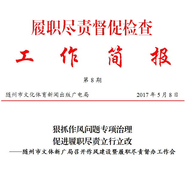 5月4日上午省文化厅陶宏家副厅长一行在随州召开了暗访广水、随县两地网吧情况通报会后,市文体新广局迅速行动,在5月5日上午开展了作风建设突出问题专项治理暨接受履职尽责督促检查工作督办会。 会议首先学习了中共随州市纪委印发《关于2017年开展作风建设突出问题专项治理的方案》的通知精神。文件要求“坚持挺纪在前,动辄则咎,对违纪违规、失职失责问题‘开刀问斩’,形成强大震慑,促进党员干部务实重行,担当作为……。通过学习增强了干部职工的紧迫感和危机感。 省文化厅督查组在暗访中发现我市文化市场管理还存在四个不到位:一是市场监管不到位;二是保障不到位;三是技术措施不到位;四是文化市场综合执法改革不到位。黄苹同志指出我们针对存在的问题,要痛定思痛、举一反三,一是把提升作风建设与履职尽责工作结合到位;二是把强化责任,善于发现问题处理问题的能力提高到位;三是要晓之以理,动之以情把为人民群众服务工作做到位;四是把为党尽忠,为国尽责的信念坚定到位。情到深处,动之以容。黄苹同志深情地指着入党誓词感慨地说,“随时准备为党和人民牺牲一切”,命都可以不要,难道还怕工作上的困难吗? 黄苹同志要求市局分管领导和市文化市场执法支队会后马上到县市区调查省文化厅暗访存在的问题,当天晚上听取督办工作汇报,确保问题在一周内整改到位。 黄苹同志强调,局领导班子成员要带头履职尽责,各工作组要尽快深入各地各单位扎实开展工作。