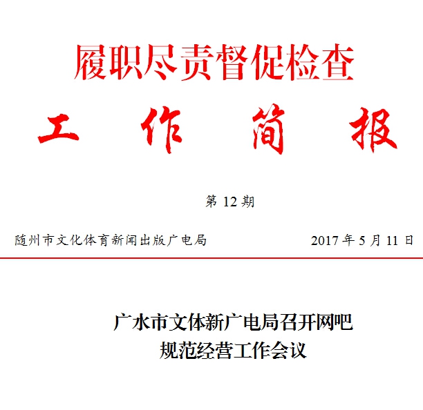 为进一步加强广水市网吧管理,规范经营秩序,5月9日上午,广水市文体新广电局召开网吧规范经营工作会议。市文体新广电局局长李江平在会上要求,全市各网吧要结合文体新广系统履职尽责工作相关要求,按照文化市场相关管理规定,认真开展自查自纠,对照查找的问题列出清单,逐一整改到位,确保网吧规范经营。