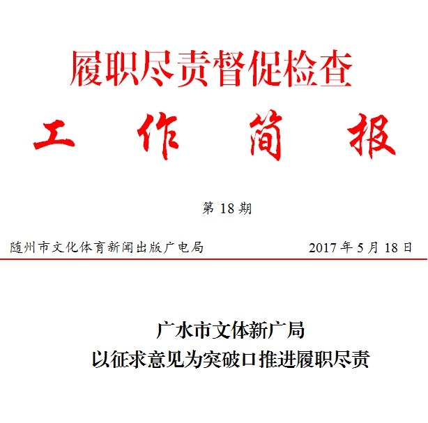 广水市文体新广系统主动接受各级部门和群众监督评议,在电视台、广水政府门户网站作出了履职尽责公开承诺,制定了点题督查体育问题整改责任书,聘请了8名政风督查员,积极主动接受监督,增强履职尽责工作的操作性和透明度。