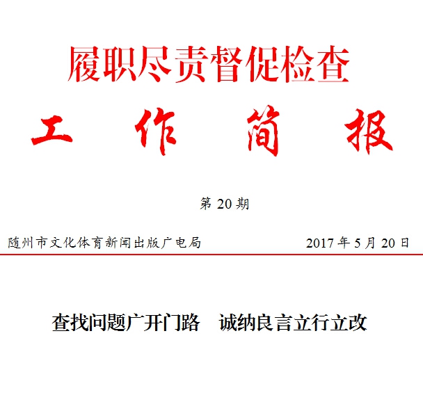 随州市文体新广局在全市文体系统接受履职尽责督促检查工作进入查找问题阶段,采取查找问题广开门路、诚纳良言立行立改的积极态度,多门路、多渠道、多层次、多方式征求意见和建议。 为把查找问题阶段的工作落小落细落实,按照广泛征求意见、开展明察暗访认真查摆问题,坚持以问题为导向,边查边改。一是通过公布举报电话、设立举报信箱、发放调查问卷等形式征求意见和建议,加强与“两代表一委员”的联系沟通,诚恳征求意见和建议;二是对全市文体新广系统开展明察暗访,及时发现纠正存在问题;三是召开服务对象座谈会,听取意见和建议,并对服务对象反映强烈的突出问题和重点事项,在一定范围内公开;四是坚持把边查边改贯穿于督促检查工作全过程。下一步针对自查中发现的问题和群众反映的意见建议,认真分析原因,制定整改措施,并逐步形成制度加以规范。
