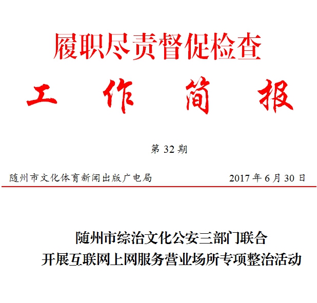 自6月23日随州市文化市场专项整治行动启动仪式后,市综治办、市文体新广局、市公安局三部门再出重拳,强力整治文化市场。三部门联合印发了《随州市互联网上网服务营业场所专项整治工作方案》(随综治办〔2017〕14号),重点开展打击上网服务营业场所违规接纳未成年人,不实名登记专项行动。 专项行动旨在政府主导,部门职动,相互协作,形成互联网上网服务营业场所市场监管合力。坚持舆论宣传,社会监督,惩教并重,引导互联网上网服务营业场所自觉守法经营。通过开展专项行动,探索建立长效监管机制,有效遏制互联网上网服务营业场所违规接纳未成年人及不实名登记现象,全面清理各种违法,有害经营,不断改善经营环境,规范经营秩序。 在此专项行动中,文化与公安部门携手共同履行职责。文化部门主要负责查处互联网上网服务营业场所违规接纳未成年人行为,对违规场所给予警告、罚款、停业整顿,直至吊销《网络文化经营许可证》,并列入湖北省诚信体系黑名单。公安机关主要负责查处互联网上网服务营业场所违规不实名登记行为。对违法经营被文化行政部门、公安机关给予停业整顿行政处罚的上网服务场所,由综治、公安部门依法依规予以处理。对情节严重的,坚决实行挂牌督办、实行“一票否决”。专项整治活动中,同时对互联网上网服务营业场所的安全隐患进行全面检查。 网吧违规接纳未成年人上网,严重危害未成年人身心健康,一直是人民群众投诉集中的问题之一,各地各相关部门要高度重视,以“暑期集中行动”为抓手,积极构筑网吧专项整治的“六道防火墙”,有效预防和严查重罚互联网上网服务经营场所违规接纳未成年人和不实名登记行为。