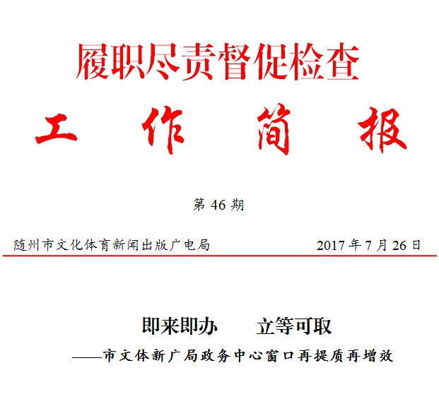 市文体新广局全面落实推进简政放权、放管结合、优化服务行政审批制度改革,结合文体新广工作特点,与时俱进,创新思维,履职尽责,务实有效,“放、管、服”等各项工作有序开展,实现了规范化、公开化、制度化。“阳光服务、微笑服务、规范服务、廉洁服务”是市文体新广局政务中心窗口永恒的服务理念,在实际工作中树立为申办单位和公民服务的意识,实现由管理向服务的意识转变。