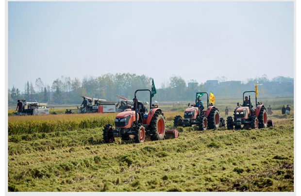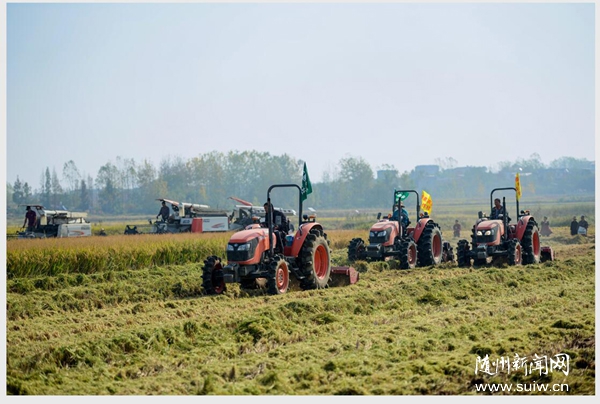 随州新闻网讯 10月11日,全市2018年秋冬播暨农机化生产现场会在曾都区万店镇黄家畈村召开。现场数十台联合收割机、秸秆打包机、旋耕机、施肥机、播种机同时作业,一条龙完成水稻收割、稻草打包、耕地、施肥和小麦、油菜的播种。会议要求,进一步提升农业生产机械化水平,掀起秋冬生产高潮。(本报记者 李文军摄)