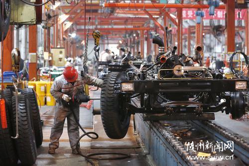 开年以来,东风随州专用汽车有限公司持续呈现产销两旺的良好形势,目前已销售底盘1319台、改装车161台。图为东风随州专用汽车有限公司忙碌的生产线。 (随州日报全媒体记者徐斌摄)