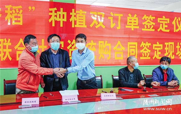 4月24日,随州市众联粮食生产专业合作社联合社分别与湖北大自然米业公司、随州市瑞泰农业科技公司等米业公司和种子供销商签订了近3万亩“随州香稻”种植、收购“双订单”协议。协议对种子质量、栽培技术、稻谷收购标准、付款时间比例等进行了约定。收购方承诺将在国家保护价的基础上每公斤加价0.46元,即每公斤结算价不低于3.00元收购符合标准的稻谷。助力我市品质农业发展和脱贫攻坚工作。(随州日报全媒记者李文军摄)