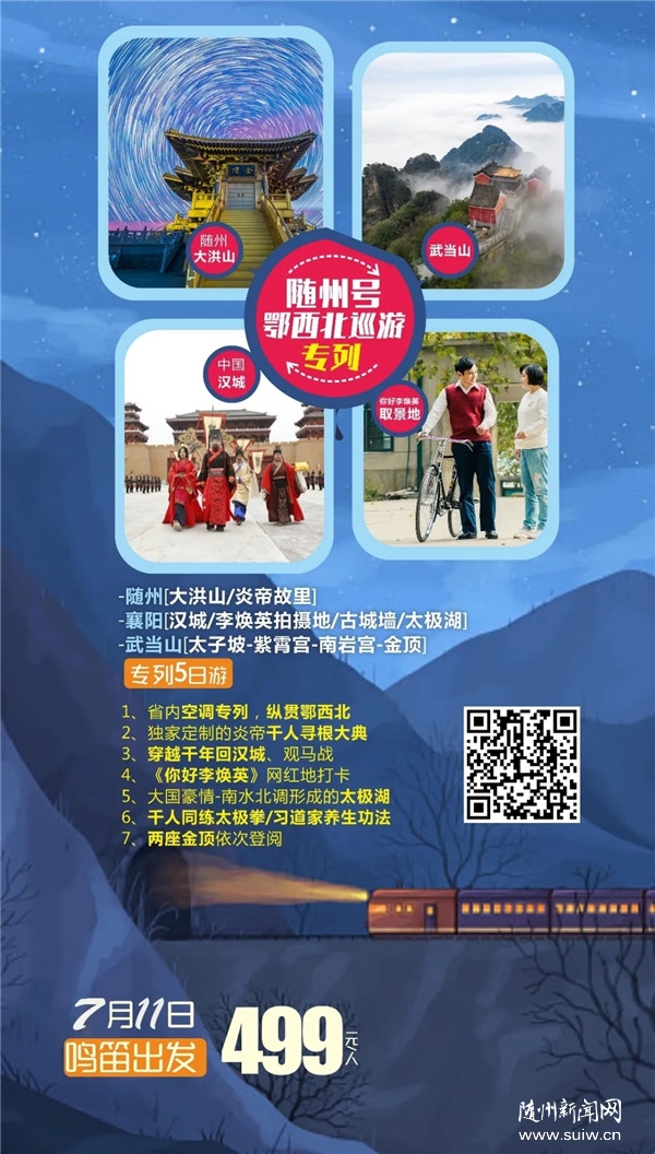 您有没有想过,坐上一辆舒适的空调专列,在盛夏酷暑之际,悠然悠然地行驶在鄂西北广袤的土地上,与山川对话,听江河呢喃,看盛世繁华、美景成画,读人文自然、享生命之传奇美好,穿越千年、梦回大汉…… 那么来了,由湖北峡州国旅策划组织的我省首发“随州号”鄂西北巡游专列将于7月11日鸣笛出发,一线串连随州、襄阳、武当山知名景点,精心打造属于这个夏季非同一般的旅行体验,让您在绿水青山间,感受“自到仙山不知老,凡间唤作几千年”的惬意与清凉。