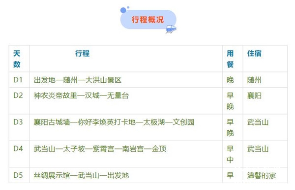 随州、襄阳、武当山5日游抢先看 行程亮点 旅行专家首推景点,行程轻松不劳累!留够充足游览时间! ★ 特别安排省内空调专列,行程舒适安全有保障。 ★ 独家定制炎帝千人寻根大典,追寻炎帝始祖的前世今生 ★ 重温革命先烈峥嵘岁月--大洪山革命纪念馆 ★ 金戈铁马闻征鼓,只争朝夕启新程,观马战,穿越千年回汉城。 ★ 襄阳网红景点《你好,李焕英》网红打卡地 ★ 探寻大国豪情——南水北调形成的太极湖 ★ 游览世界文化遗产【武当山】,体验千人同练太极拳、习道家养生功法。 行程安排