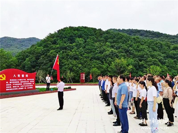 重走长征路,砥砺新征程。7月11日,广水市关庙镇近百名党员干部赴桐柏山太白顶田王寨景区,开展红色教育实践活动。当天,大家参观了红军纪念馆,聆听红军战斗故事,重走了红军长征路,依次瞻仰红军泉、红军哨卡、战壕、碉堡等红色遗址。图为关庙镇党员干部在红军长征纪念塔前重温入党誓词。(随州日报通讯员黄萍、蒋东岭摄)