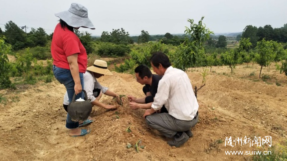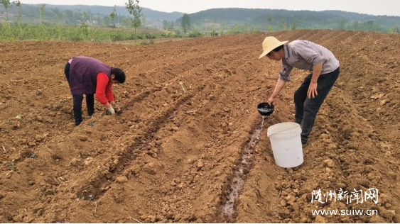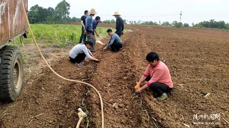 5月11日,在随县澴潭镇余庙村的紫薯地里,该镇农技中心工作人员正在指导农户对工业紫薯苗进行移栽定植。