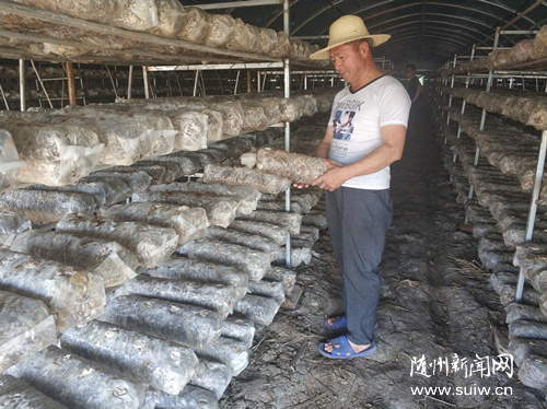 在村办企业随县萌阳食品有限公司,2020年新扩建的20万袋春栽香菇基地大棚里,56岁的贫困户王清友和工友们正在检查春栽菌棒的养菌情况,并用打孔机对菌棒进行打孔。几人互相配合,取棒、打孔、上架,动作娴熟。