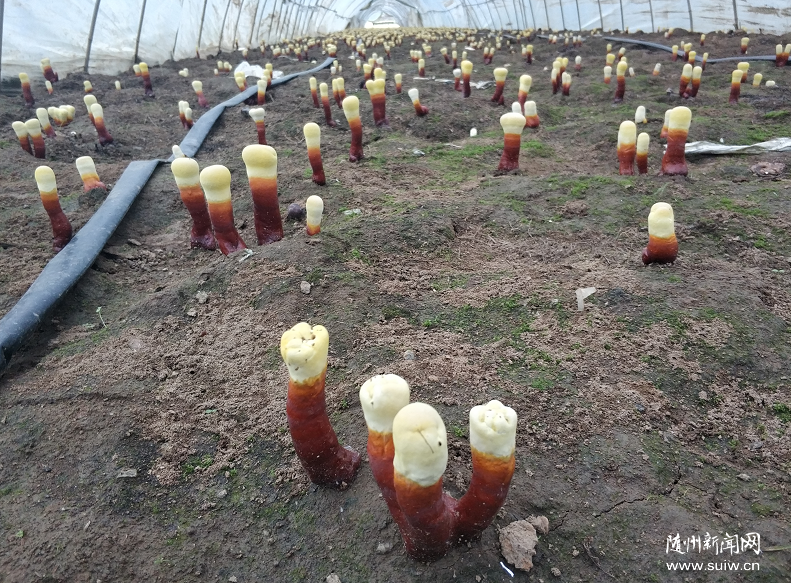 走进涢阳村灵芝基地大棚,只见成片的灵芝苗翘首相迎,嫩黄的脑袋、枣红的身子,十分呆萌可爱。据介绍,2020年强力合作社的两个灵芝基地共采购椴木100万斤,种植椴木灵芝150个大棚。