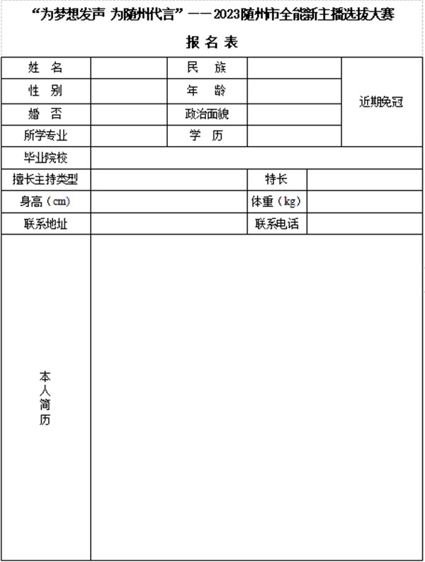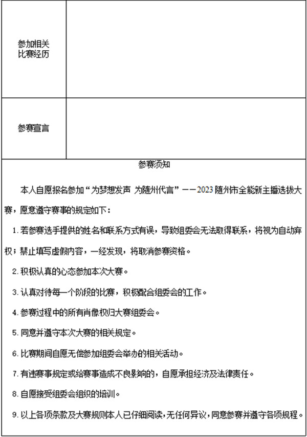 手机下载“云上随州”APP,进入“为梦想发声为随州代言——2023随州市全能新主播选拔大赛”专区下载报名表报名。