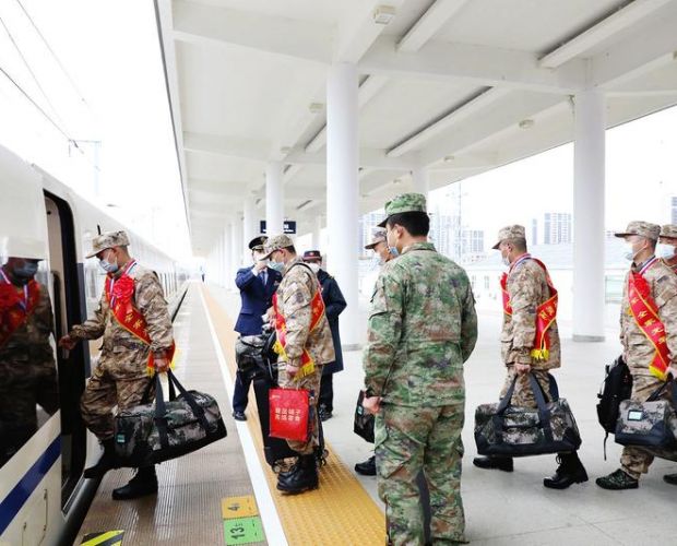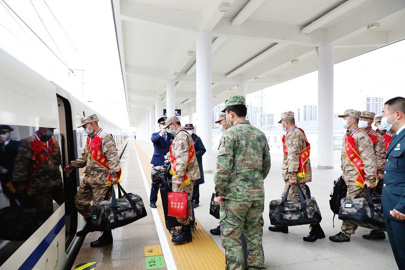 3月17日,随州市2023年春季新兵起运,100余名随州好男儿身着星空迷彩,肩披红绶带,胸戴红花,踏上参军入伍、卫国戍边的征程。市委常委、军分区司令员琚万勇等到车站为新兵送行。