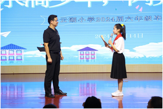 白云湖小学副校长谢建鄂的精彩致辞,表达对毕业生诚挚祝愿的同时,还提出了殷切希望,让全体毕业生始终保持对学习的热爱,对生活的热情,勇敢地去追求自己的梦想,母校将永远是他们的坚强后盾。