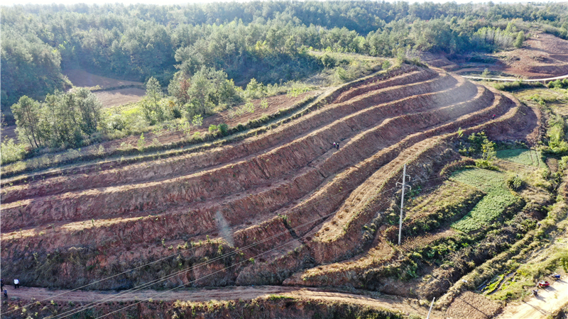 在澴潭镇岳雄丰油茶基地,工人正忙着整理管道,进行水肥一体化建设项目的收尾工作。