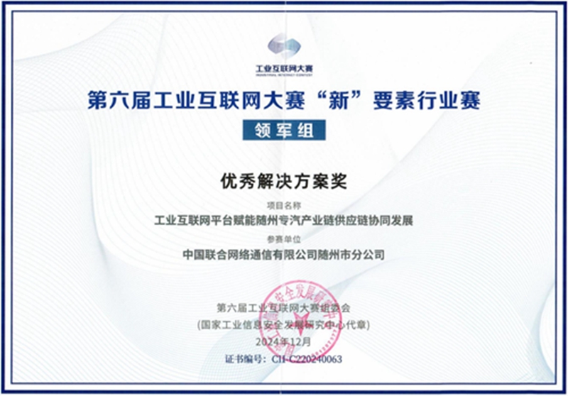 (图:随州联通工业互联网平台荣获第六届工业互联网大赛“新”要素行业赛优秀解决方案奖)