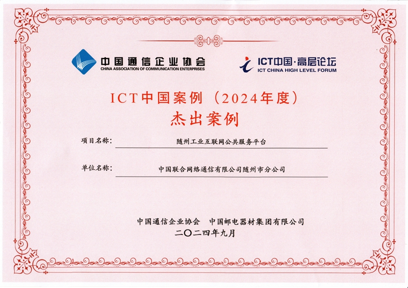 (图:随州联通工业互联网项目荣获ICT中国(2024年度)杰出案例)