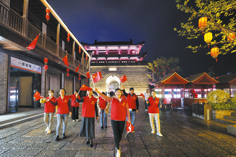 一批志愿者在草甸子街挥舞着国旗庆祝国庆节