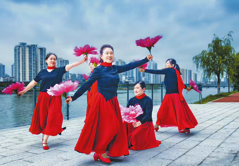 白云湖边,几位市民用舞蹈欢庆节日