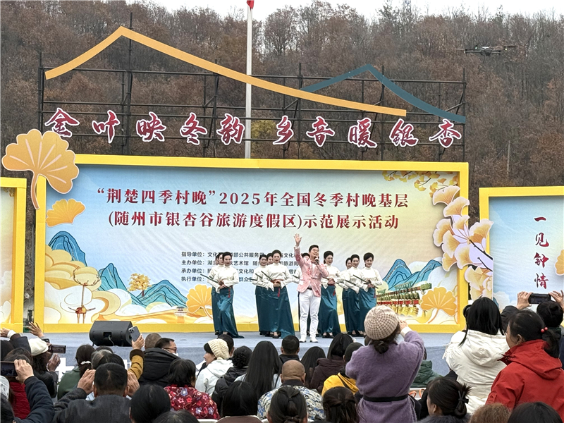 冬日的曾都区洛阳镇,连绵的银杏林褪去金黄,枝干遒劲地指向天空。在九口堰新四军第五师革命旧址纪念馆门前广场上,锣鼓铿锵,丝竹悠扬,舞姿翩跹。12月4日,“荆楚四季村晚”2025全国冬季村晚基层(随州市银杏谷旅游度假区)示范展示活动在这里开演,为冬日乡村带来了一抹亮丽的文化暖色。
