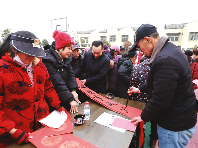 1月28日,学习贯彻党的二十届四中全会精神暨“炎之有理”文艺宣讲活动走进随县唐县镇桃园村。本次活动采用“理论+文艺+民俗”的融合形式,让政策宣讲更接地气、更入人心,将党的二十届四中全会精神送到农民的家门口。图为书法家们为村民送春联和福字。