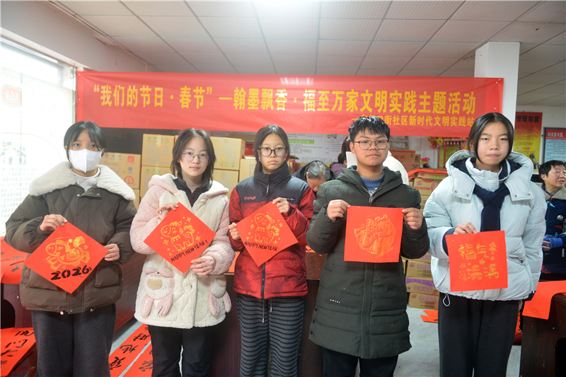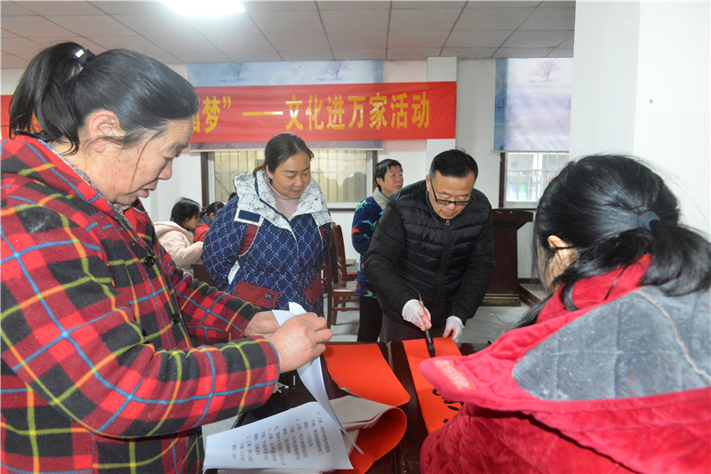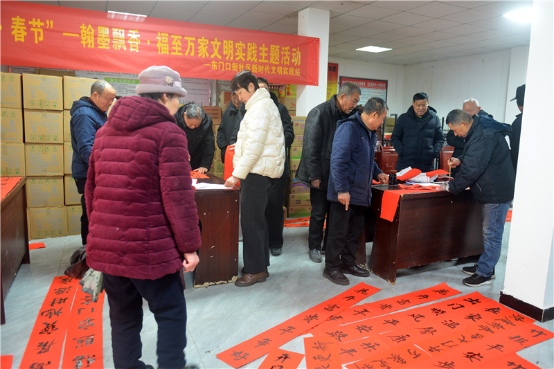 2月9日,曾都区群艺馆、区图书馆、区非遗中心,淅河镇人民政府,淅河镇综合文化站联合组织开展文化惠民进万家活动。在淅河镇东门口社区,来自曾都区的书法们依次为居民们书写喜迎马年的新春联,为淅河镇的居民送去新春的祝贺。淅河镇还组织少儿为居民制作“喜迊新年”工艺品,受到了社区居民的称赞。(通讯员曲晧然、王涛摄)