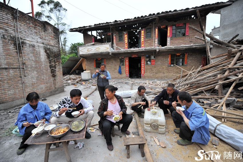 芦山县古城村月光山组的张平书和家人在屋前吃饭,三兄弟喝着啤酒,他们相信政府会帮助灾后重建,自己也在努力抗震自救。