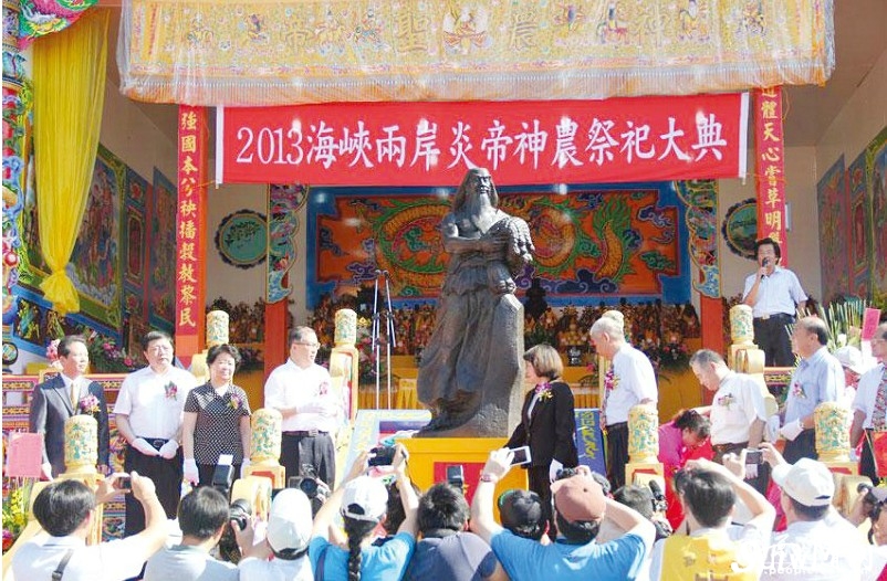 随网讯 通讯员王轩报道:千里迎圣祖,万民祭神农。在中华民族人文始祖炎帝神农圣诞来临之际,5月31日,海峡两岸近千名炎黄子孙在台湾嘉义市隆重集会,举行2013海峡两岸炎帝神农祭祀大典,共同缅怀先祖伟大功绩,祈福中华民族繁荣昌盛。 上午8时,祭祀活动在雄浑的《炎帝大歌》声中拉开序幕,现场龙腾狮跃,大旗飘扬,鼓乐齐鸣,庄严肃穆。省委书记李鸿忠,省委常委、统战部长张岱梨,省委常委、省委秘书长傅德辉,国台办政党局局长贺之军,市委书记刘晓鸣,国民党副主席、嘉义市市长黄敏惠及台湾各界代表参加大典。 大典上举行了庄严的圣火传递仪式,随县县委书记陈德贵将采自千里之外的炎帝神农故里的火种传递给台湾嘉义市大天宫董事长卢朝南,卢朝南将现场圣火盆点燃,现场圣火熊熊燃起,代表着炎黄子孙同根同源、炎帝精神薪火相传。随后,进行了炎帝神农铜像捐赠,刘晓鸣将一尊高2.3米、重300公斤的“炎帝神农”铜像赠送给大天宫。李鸿忠、张岱梨、傅德辉、刘晓鸣、黄敏惠等共同为炎帝神农铜像揭幕(右图)。 在祭祀仪式上,李鸿忠恭读了《炎帝神农寿诞颂文》。颂文说,仰觐赤帝,芝光印心。嘉禾之恩,传之万代;百谷之丰,惠及万民。伏愿天佑中华,风调雨顺。始祖恩德,长被众生。江山永固,民族之幸;唇齿相依,赤子之情。 黄敏惠在致辞中对李鸿忠率领的参访团一行表示热烈欢迎。她说,神农尝百草,是中华民族的始祖;教耕作,开创中华民族文明的生活基础。感谢神农大帝牵起两岸的缘,这是由热情、情感、文化牵起的浓浓的情,满满的缘。祝福所有人带回满满的幸福、满满的福气,心想事成、事事如意,永远幸福快乐。 最后,主祭官行三献礼,宣读炎帝神农文疏。全体起立向炎帝神农像三鞠躬,鸣炮、礼成。 大典结束后,大家还参观了当地特色产品展。大天宫创建于清康熙四十六年,内奉神农圣帝,1973年将伏羲及轩辕二位圣帝合祀一宫,是台湾唯一将三皇圣帝集于一宫奉祀的宫庙。 这次活动是由省委省政府组织的 “荆楚风·两岸情”——2013湖北宝岛文化交流活动之一。5月29日下午,刘晓鸣还随省委书记李鸿忠会见了国民党荣誉主席连战,并向连战先生赠送 “一师五进士”牌匾。连战先生祖籍广水应山,“一师五进士”讲述连战先祖北宋处士连舜宾为侍奉有病的父亲,不愿做官,潜心办学,培养出五位进士,备受世人称赞和敬仰的故事。连战先生非常感动,连声谢谢,他感谢刘晓鸣及家乡人民的惦记,送给了他一份最有特色和意义的礼物。座谈期间,连战先生多次提到家乡随州,多次向刘晓鸣询问家乡的变化,对家乡的关切之情溢于言表。 在台期间,刘晓鸣还带领我市代表团到苗栗县进行了炎帝文化交流,并向苗栗县五谷宫赠送炎帝神农铜像,考察了全球著名的电子信息和通讯产业零部件制造商正崴集团,正崴集团计划在随县投资建厂,目前项目正在落地之中。