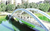 配合“创园”工作,我市对神农公园进行封闭改造,公园设施将提档升级。图为七月二日施工人员在彩虹桥上改造施工。(随州日报)