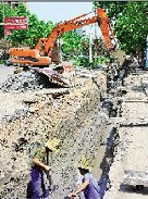 为增强城区防洪排水能力,市城市防洪排水管理处对老城区部分排水管网进行改造。图为工人正冒着酷暑在随城烈山大道安装直径1.2米的排水管道。(随州日报)