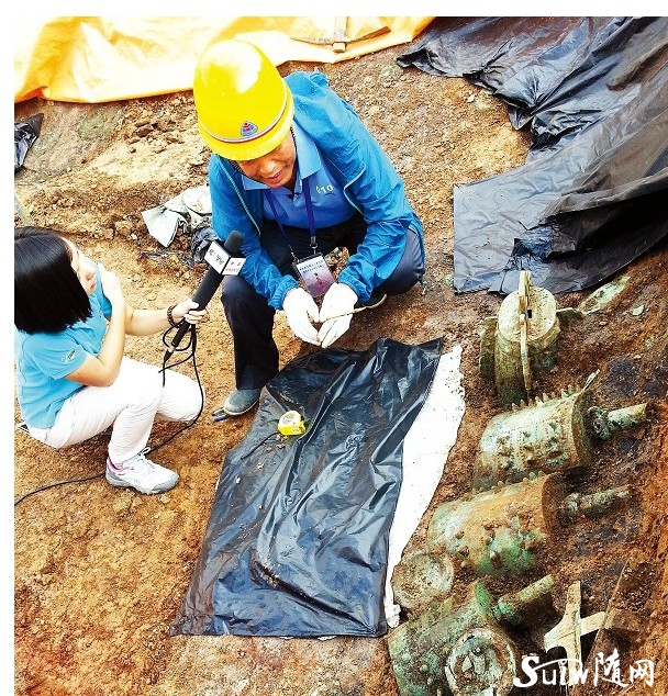 叶家山M111墓葬发掘5件编钟及部分兵器。图为黄凤春正在发掘现场接受央视记者采访。(记者 李文军 摄)