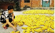 8月7日,随县唐县镇水府庙村雷从清正在晾晒刚收的玉米。今年遭受严重旱灾,雷从清将12亩农田中的7亩改种玉米获得了丰收,亩均收入可达1200元以上,将损失降到了最低。(随州日报)