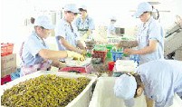 座落在随县均川镇均河岸边的金船食品公司,瞄准韩国市场生产出口泡菜,仅今年上半年就生产出口大蒜辣椒等泡菜1万吨,创汇1000万美元。图为公司员工正在包装外销的辣椒。(随州日报)