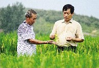 9月2日,随县万和镇晃山村老农张正银(左)和村支书韩保朝看着即将成熟的稻穗喜不自禁。今年该村遭受了严重旱灾,全村干部群众齐心协力,抗旱取得了成功,全村2300亩水稻长势良好,粒粒饱满,有望丰收。(随州日报)