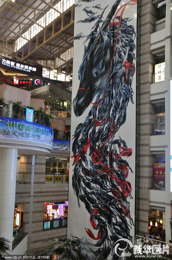 2013年9月23日,近日,路经广州市天河路的市民都会被正佳广场外色彩鲜艳的两大幅涂鸦作品所吸引。两幅作品的面积达到1500平方米,堪称巨无霸涂鸦,创作者是来自法国巴黎的涂鸦艺术家。其巨幅作品作品先后在正佳广场北广场1500平方米的外墙和商场中央中庭观光电梯绘制完成,分别就不同的主题进行高空创作,前后将历时一个月,上演了国内最大面积的商场涂鸦,成为城市公共艺术一道亮丽的风景线。据了解,这两大作品创造了艺术界的两大奇迹,分别拥有“全国单体面积最大”及“全球室内高度最高”的涂鸦艺术品称号,据主办方透露,目前正在为此两幅巨作申请世界吉尼斯纪录。高殿华/CFP