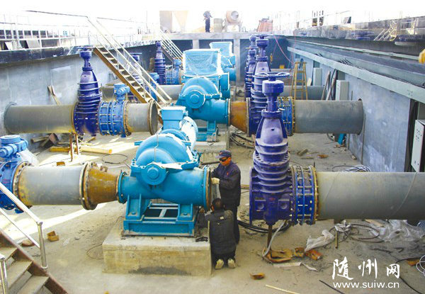 为确保年底开始供水,供水复线(封江水源)净水厂正在抓紧建设。图为高压泵房内工人正在安装设备。(随州日报)