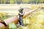 日前,城南污水处理厂污水收集管道从滨湖湾附近穿越白云湖,将在白云湖南岸接入污水收集管网。图为施工人员正在焊接污水管道。(随州日报)