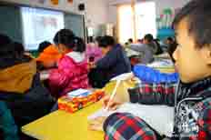 随县唐县镇小学为培训学生的美术素养,利用电子白板视频教学,教授学生简笔画和折纸。图为学生在教室通过视频学习简笔画。(随州日报)
