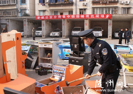 记者许静 通讯员佘敏、杨英报道:打击电子游戏机赌博专项行动开展一个月以来,曾都公安分局以开设赌场罪立刑事案件10起,侦破刑事案件6起,刑事拘留12人、逮捕1人,查处行政案件9起,行政拘留25人,罚款21人,关停场所19家,收缴赌博机137台。1月9日,曾都公安分局集中销毁了收缴的赌博机。