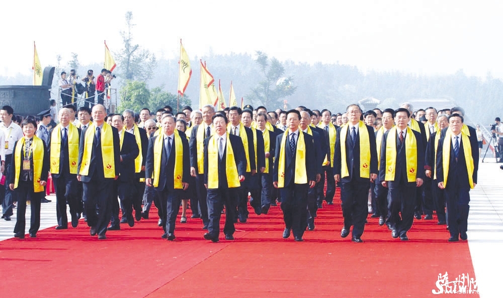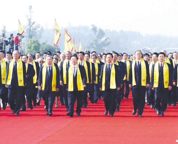 ▲参加寻根节的领导和嘉宾步入大典现场。前排为:全国人大常委会副委员长陈昌智(前排右四)、全国政协副主席孙家正(前排左四)、湖北省委书记、省人大常委会主任李鸿忠(前排右三)、全国人大环境与资源保护委员会副主任委员罗清泉(前排左三)、湖北省人民政府省长王国生(前排右二)、海峡两岸关系协会副会长李炳才(前排右一)、国务院侨办副主任赵阳(前排左二),全国文联副主席、党组成员杨承志(前排左一)。
