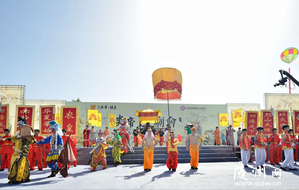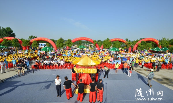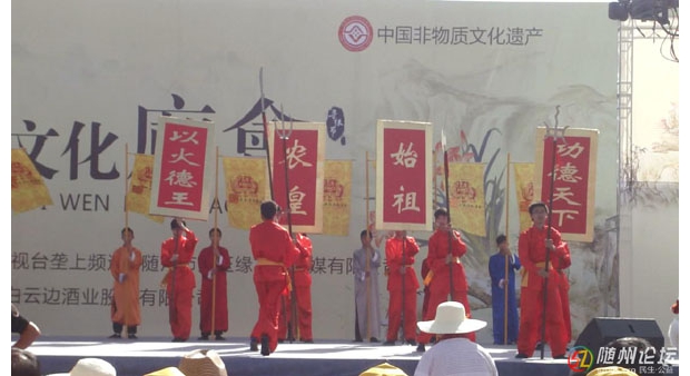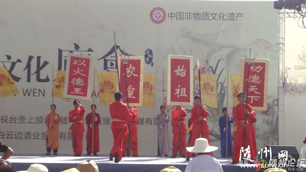 随州市长郄英才,省文联副主席易熙君,省文化厅副厅长陶宏家,市委副书记彭明方,市人大常委会副主任夏洪国,副市长李雅君,市政协副主席包毅国,市政府党组成员、秘书长李国寿等参加庙会开幕式。 据悉,今年的炎帝文化庙会为期三天,以“尽展炎帝故里民俗风采,共襄华夏人文始祖盛会”为主题,以“亲民、暖民、惠民”为办节思路,旨在进一步弘扬炎帝文化。 上午8时许,郄英才宣布乙未年炎帝文化庙会开幕,由此拉开了三天民俗盛宴的帷幕。 舞台上, 随州花鼓戏、义阳大鼓、板凳龙、打硪号子、九莲灯等11个非遗项目让市民身临其境地感受传承几千年的非遗文化的独特魅力;随县本地牛人和草根艺人拿出看家本领一展身手,表演形式多种多样、不拘一格,歌曲反串、民俗舞蹈、情景小品、方言快板……来自随县民间的1200余名农民演员,将在5个专场演出中依次呈现80余个涵盖了非遗文化及绝技绝活表演的文艺节目,为游客带来无与伦比的视听享受,真正让群众在庙会活动中唱主角,让农民表演自己爱看的戏。