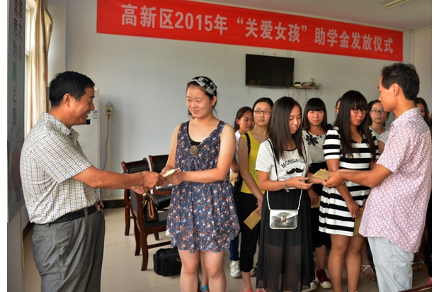 随州网讯 随州高新区2015“关爱女孩”助学金发放仪式日前在淅河镇举行,来自高新区的28名困难独生子女和双女户的大学新生每个人领到了2000元的助学金。(记者 孙洪涛 通讯员 王涛摄)