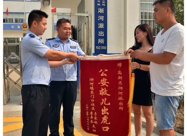 随州网讯 随州高新区淅河镇老街社区居民李丰岭之子被骗入安徽某传销点,人身自由受到限制,淅河派出所接到报警后,迅速出动,成功将其儿子解救回家,夫妻俩特意送去锦旗,以表感谢之情。(记者 孙洪涛 通讯员 王 涛摄)